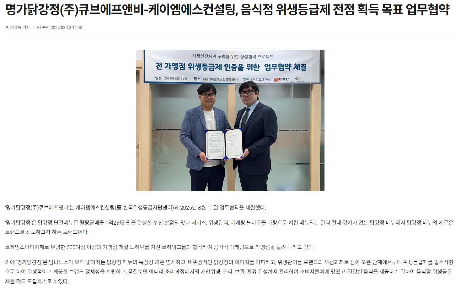 ‘명가닭강정(주)큐브에프앤비’는 케이엠에스컨설팅(舊 한국위생등급지원센터)과 2025년 8월 11일 업무협약을 체결했다.